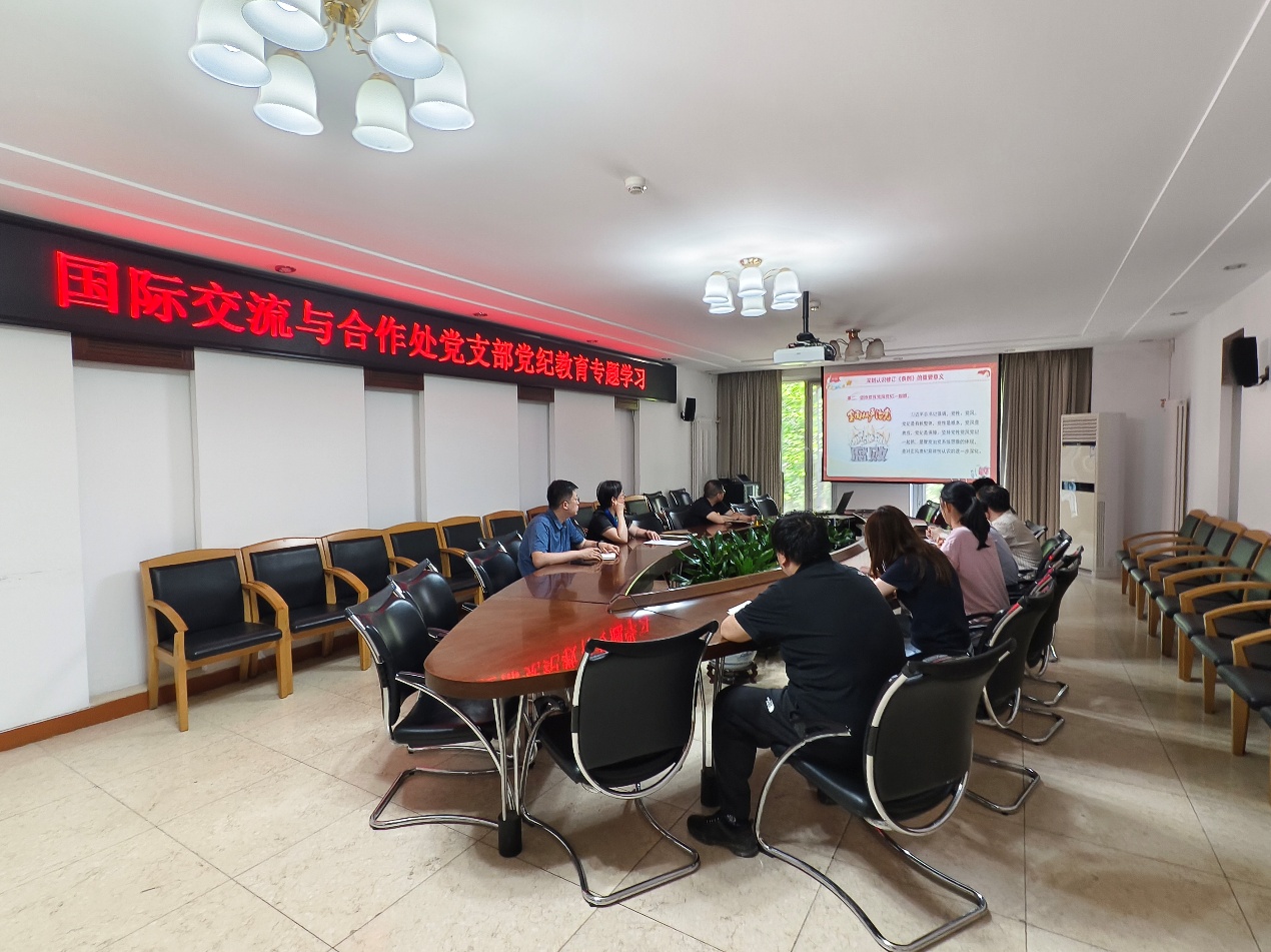 自我处党支部全体党员5月22日参加全校师生党员第二次基本培训暨党纪学习教育专题党课以来,为深入学习领会新修订的《中国共产党纪律处分条例》,教育引导党员学纪、知纪、明纪、守纪,根据机关党委党纪教育学习相关安排,5月28日,国际交流与合作处党支部书记王锦以“学条例守党纪 保障国际交流合作高质量发展”为主题,为支部全体党员讲授党纪学习教育专题党课。