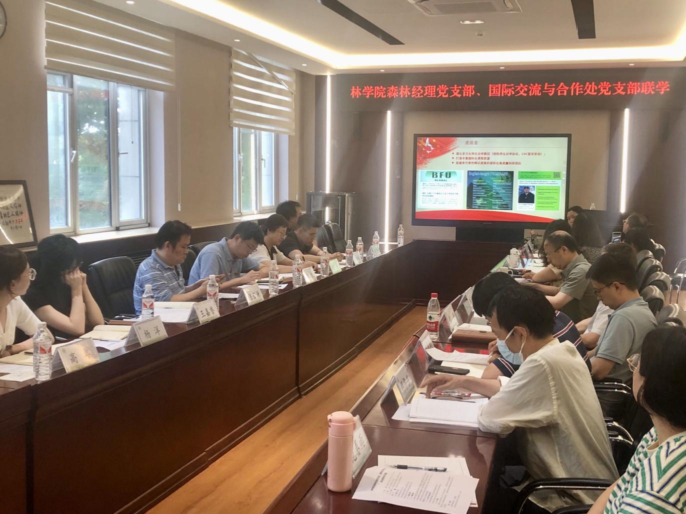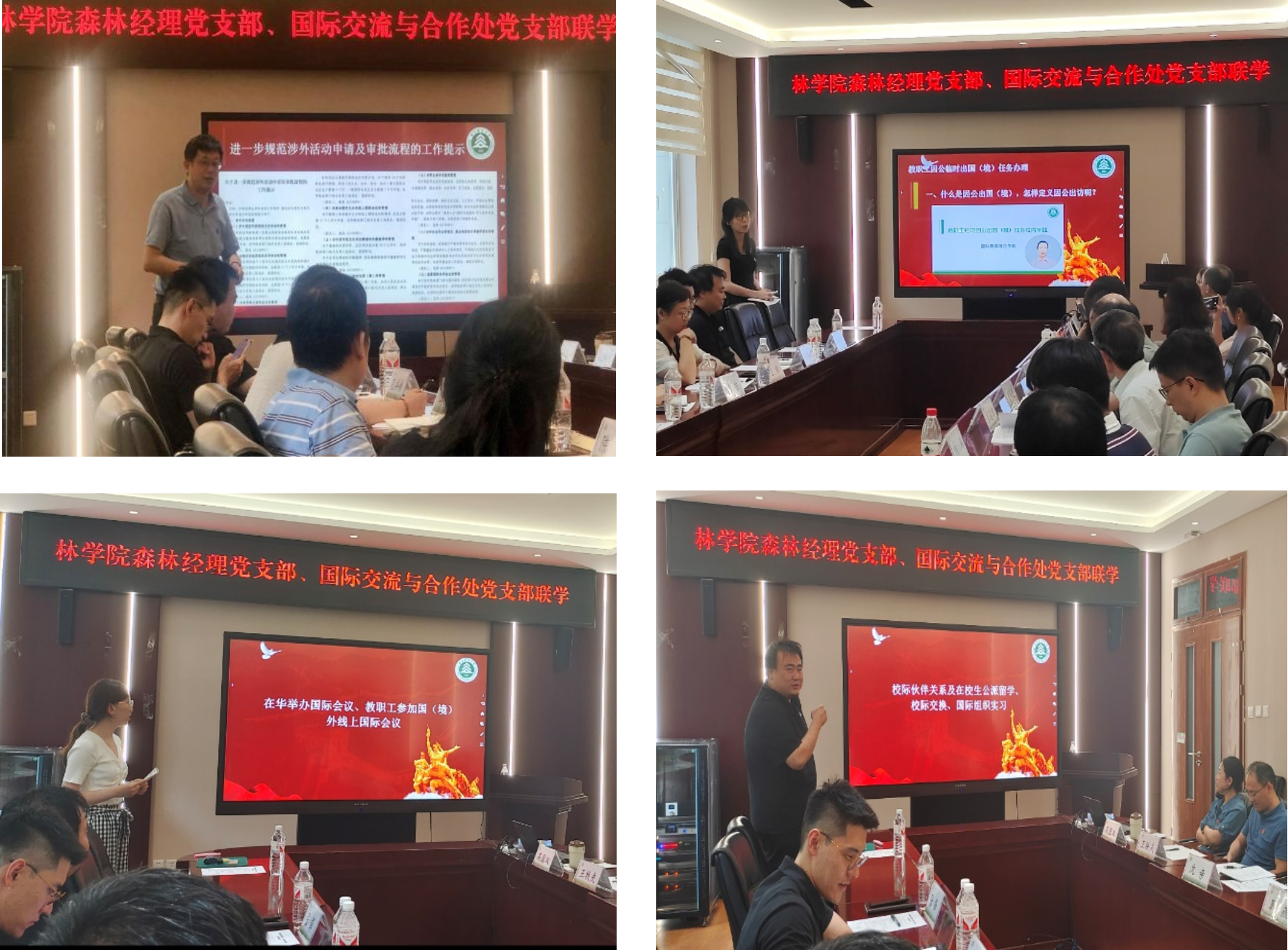 近日,国际交流与合作处(以下简称“国际处”)党支部全体党员、入党积极分子一行8人前往林业楼411,同林学院森林经理党支部围绕“中国共产党人的精神谱系”这一主题开展党建联学。结合学校纪委编发的《警示教育典型案例汇编》等文件,开展党纪和警示教育学习,并进行交流研讨和微党课展示;围绕“服务师生助推国际化工作提质增效”这一机关党委党建引领工作站中国际处所涉专题,以林学院国际化发展实际需求为中心,国际处党支部主动送课上门,践行党建业务“一融双高”。