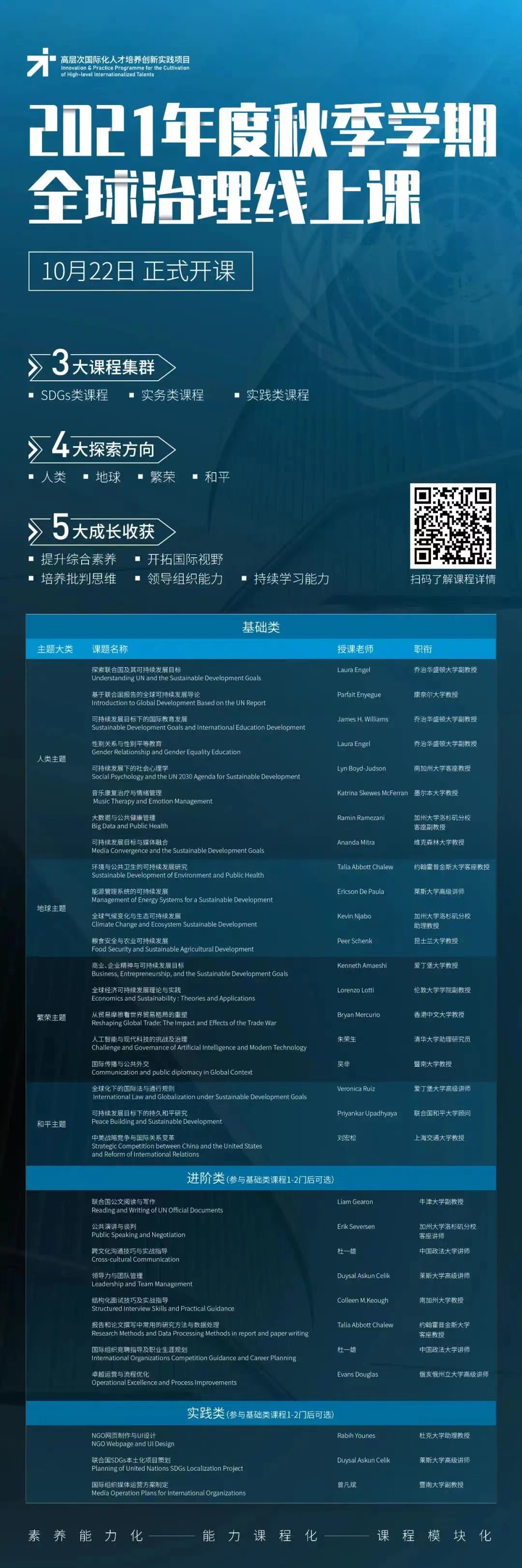 我校已于2020-2021学年的春季和秋季学期成功地组织学生参加国际组织人才项目全球治理在线开放课程,近100名学生参加了课程并学有所得。2021-2022学年秋季学期的选课工作即将开始,现将有关事宜通知如下: