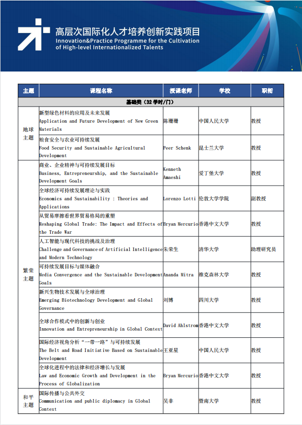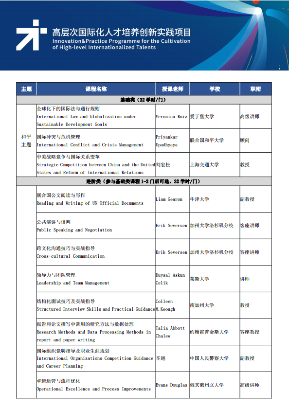 1、本系列基础类课程由我校全额资助,除享受来自世界知名高校具有联合国相关的工作经验的教授授课之外,还可免费参加国际组织人才培养项目专业讲座;