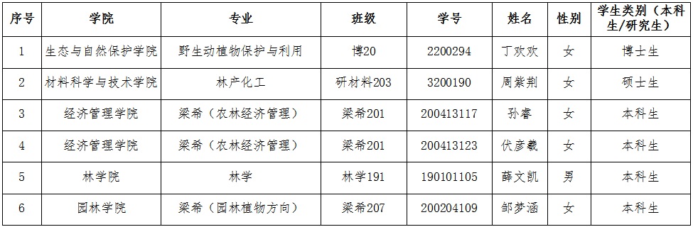 我校本着“公平、公正、公开”的原则,向经济管理学院、林学院、材料科学与技术学院、园林学院及生态与自然保护学院合理分配资助名额,经过院内通知、选拔及推荐名单上报,由国际处进行终审确认,现拟推荐以下同学参与2022年加拿大不列颠哥伦比亚大学林业网络夏令营项目,取得项目合格证明后每位同学将获得我校全额奖学金(1000加元/人)资助。拟选派学生信息公示如下: