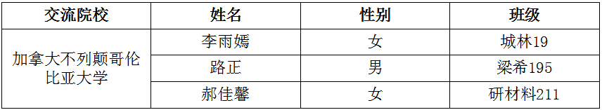 经学生自愿申请、学院推荐及校内专家评审,我校现拟推荐学生3名参加2022-2023学年加拿大不列颠哥伦比亚大学校际交流项目。根据彼此校际合作伙伴协议,本项目由外方提供全额资助。拟选派学生信息公示如下: