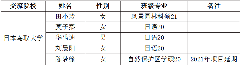 经学生自愿申请、学院推荐及校内专家评审,我校现拟推荐学生5名参加2022年秋季学期日本鸟取大学校际交流项目。根据彼此校际合作伙伴协议,本项目由外方提供全额资助。拟选派学生信息公示如下: