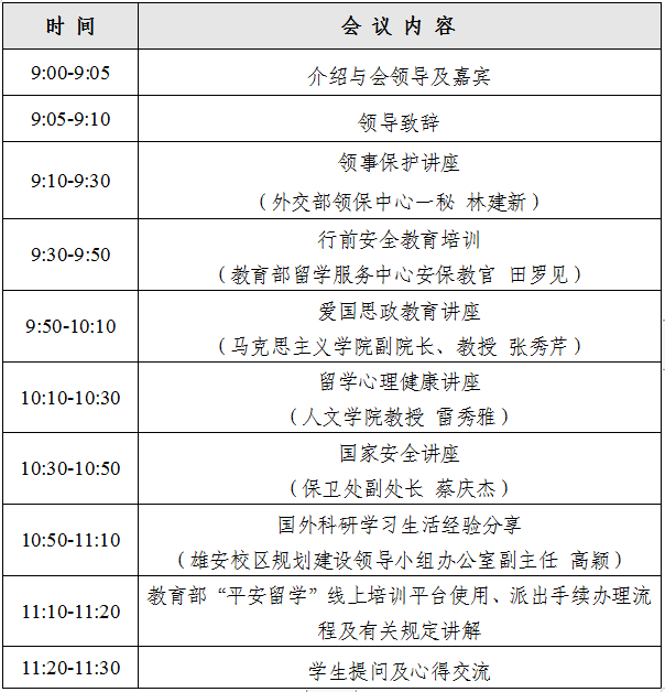 为高效有序开展我校学生赴外留学管理相关工作,我校将举办2022年“平安留学”学生赴外交流行前培训会,本次培训会特别邀请到教育部留学服务中心及校内专家进行专题培训,具体安排如下: